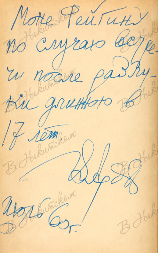 166, [6] с. 20,8 х 13,9 см. В картонажном издательском иллюстрированном переплете, тканевый корешок. На обороте форзаца 2а автограф автора: «Моне Фейгину / по случаю встре- / чи после после разлу- / ки длинною в / 17 лет. / (подпись)».