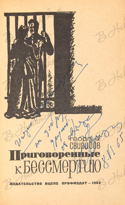 Свиридов, Г. [Автограф]. Приговоренные к бессмертию. М.: Издательство ВЦСПС ПРОФИЗДАТ, 1965.