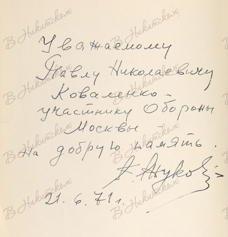 624 с., 50 л. ил., карт. 20 х 14 см. В издательском переплете. На обороте форзаца 1б автограф: «Уважаемому / Павлу Николаевичу / Коваленко - / участнику Обороны / Москвы - / на добрую память. / Г. Жуков / 21.6.71 г.»