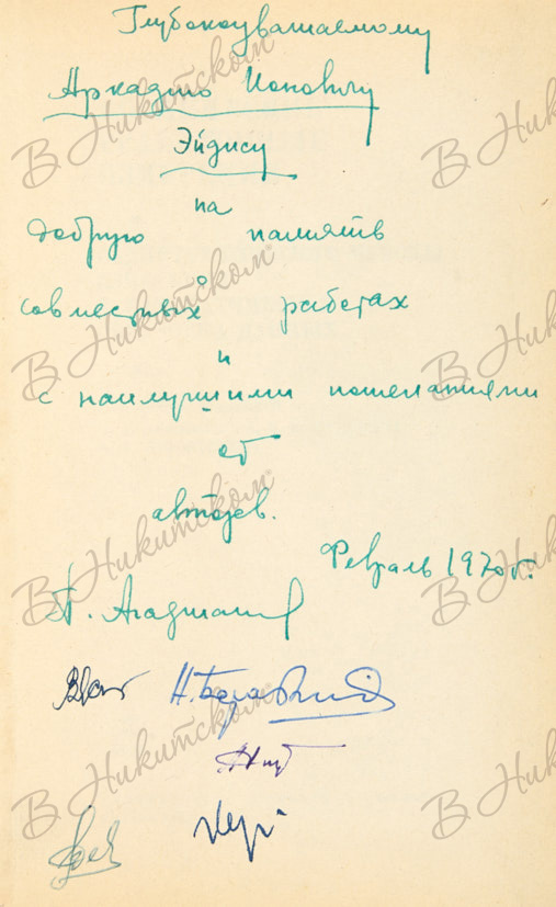 497, [7] с. 20,5 х 13,5 см. В издательском переплете и суперобложке. Утрата мелких фрагментов суперобложки, небольшие загрязнения переплета. Блок чистый. На форзаце 2а дарственная надпись: «Глубокоуважаемому / Аркадию Ионовичу / Эйдису / на добрую память / о / совместных работах / и / с наилучшими пожеланиями / от / авторов. / Февраль 1970 г. / (подписи)».