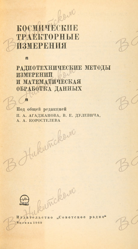 [Автографы авторов]. Космические траекторные изменения. Радиотехнические методы измерений и математическая обработка данных / под общей редакцией П.А. Агаджанова, В.Е. Дулевича, А.А. Коростелева. М.: Издательство «Советское радио», 1969.