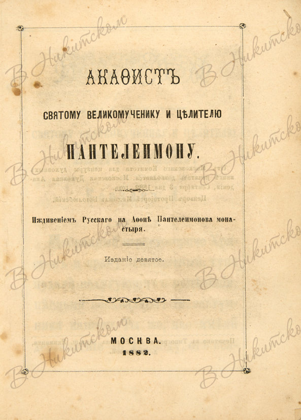 Акафист святому великомученику и целителю Пантелеимону. Издание 9-е. М.: Печатано в Типографии И. Ефимова, 1882.