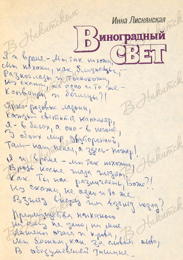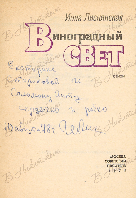 Лиснянская, И. [Автограф С. Апту]. Виноградный свет. М.: Советский писатель, 1978.