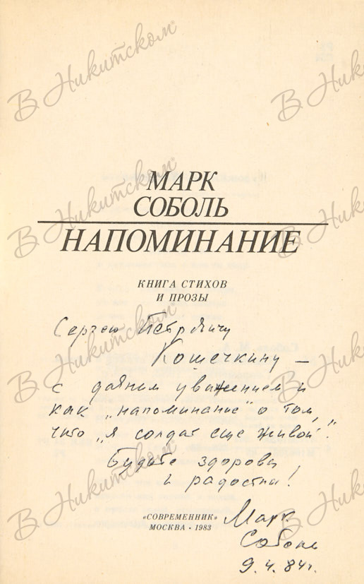 172, [2] с., ил. 16,5 х 10,6 см. В издательской обложке. На титульном листе автограф: «Сергею Петровичу / Кошечкину - / с давним уважением и / как «напоминание» о том, / что «я солдат еще живой». / Будьте здоровы / и радостны! / Марк / Соболь / 9.4.84 г.».