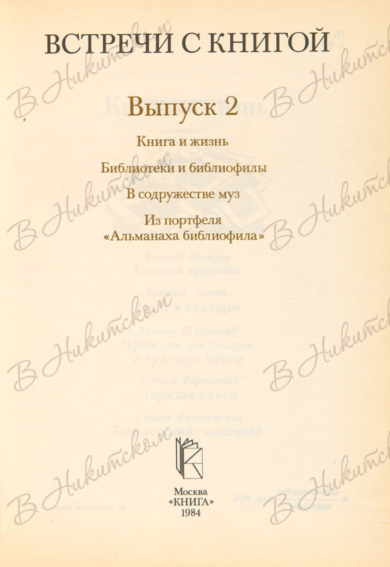 Встречи с книгой. Вып. 2: книга и жизнь, библиотеки и библиофилы/ Всесоюзное добровольное общество любителей книги. М.: Книга, 1984.