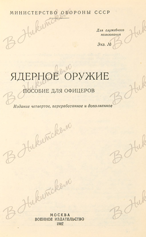 [Для служебного пользования]. Ядерное оружие. Пособие для офицеров. Издание 4-е, перераб. и дополн. М.: Военное издательство, 1987.
