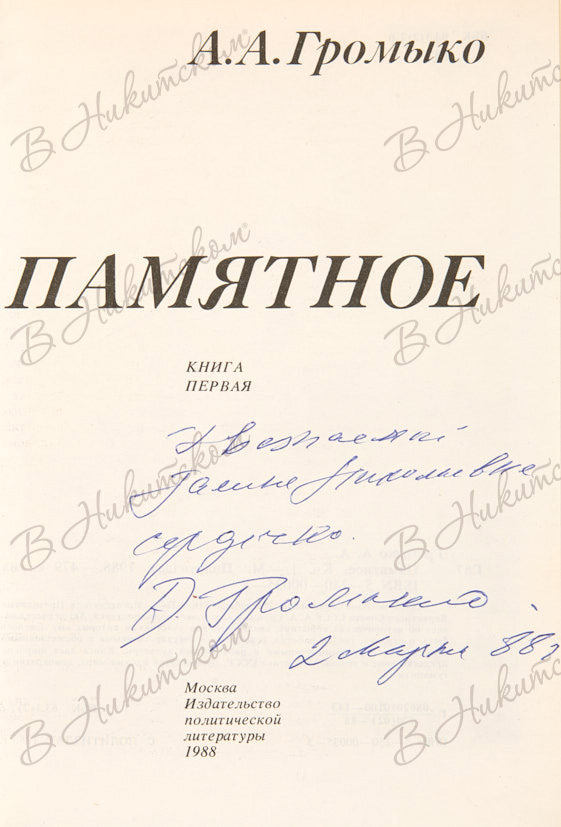 Громыко, А.А. [Автограф]. Памятное. Кн. 1. М.: Издательство политической литературы, 1988.