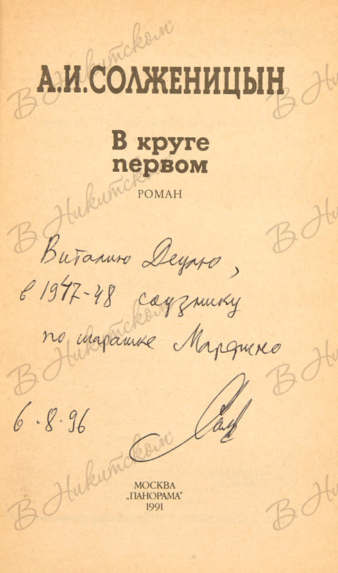 Солженицын, А. [Автограф художнику В. Деулю]. В круге первом. М.: Панорама, 1991.