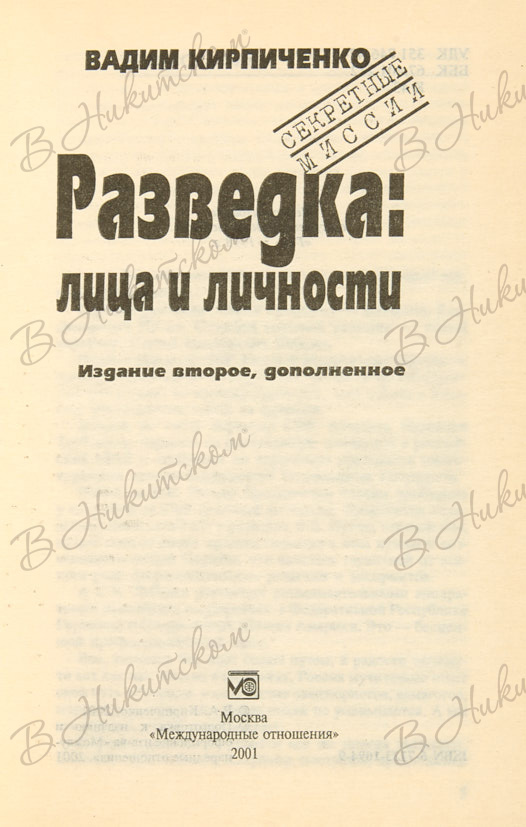 Кирпиченко, В. [Автограф]. Разведка: лица и личности. М.: «Международные отношения», 2001. Издание 2-е.