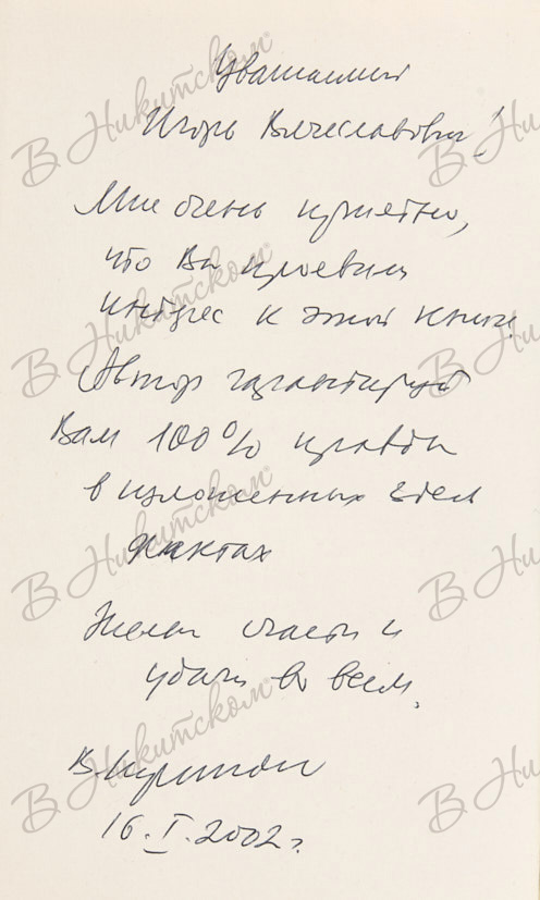правды / в изложенных здесь / фактах / Желаю счастья и / удачи во всем. / В Кирпиченко / 16.I.2002 г.».