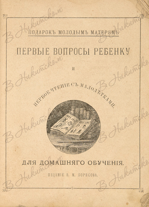 1. Деркачев, И. Прежде азбуки: Первые вопросы ребенку и первое чтение с малолетками / И. Деркачев. Тула: Издание В. М. Борисова, 1889. 3-160 c., ил.