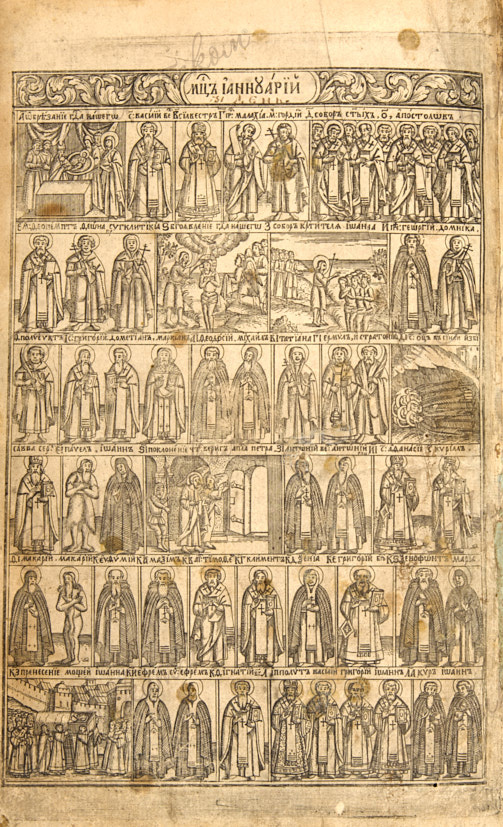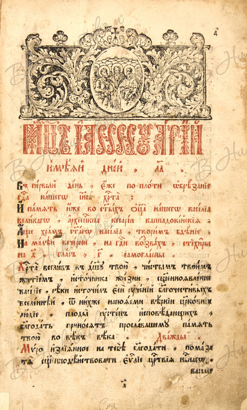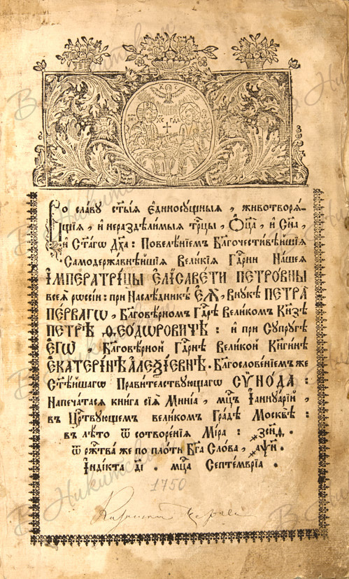 1 тит. л., 1 грав., 1-420, 1-16 л. 30 х 18,7 см. Орнамент: заставки, концовки. Печать в две краски. Переплет эпохи: доски, кожа. Реставрация корешка (фрагменты старинной кожи дублированы на поздний корешок), незначительные потертости и утраты кожи на крышках, лист с гравюрой реставрирован по полям с оборотной стороны (бумага), незначительные пятна в блоке, мелкая реставрация бумагой. Утрата фрагмента л. 7, 133 (затронут текст), уголка л. 62, 130 195, 456 (текст не задет), надрывы и утраты фрагментов нескольких страниц. На титуле внизу надпись «Казанской церкви», на л. 1-24 вкладная запись: «Сия книга минея месячная в Москве ... 12 книг дано 24 на церковные деньги усердным рачением в собрани денег старосты церковного Петра Афанасьева 1753 год февраля 23 дня».