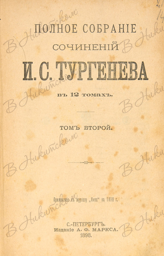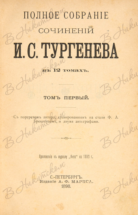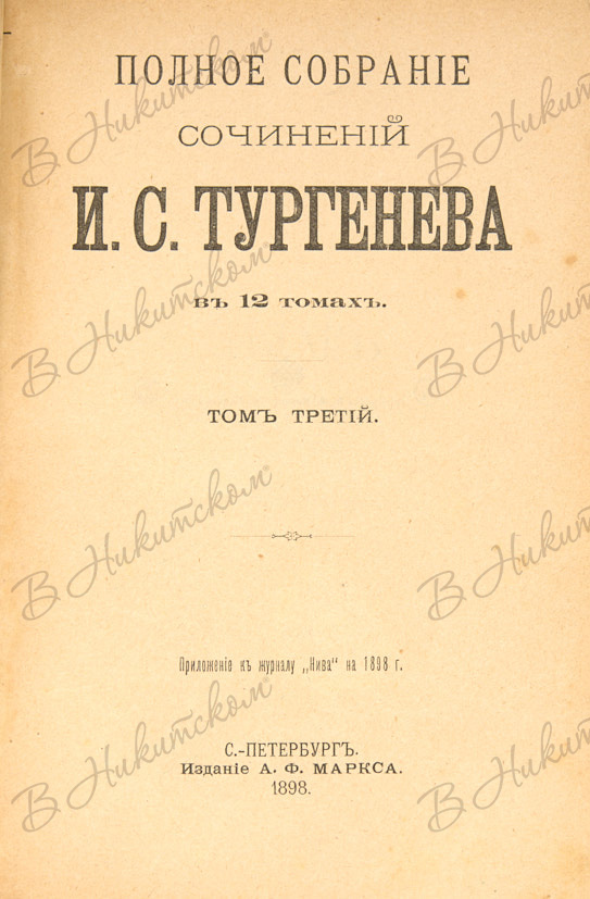 Тургенев, И. Полное собрание сочинений И.С. Тургенева. В 12 т. Т.1-12. СПб.: Издание А.Ф. Маркса, 1898.