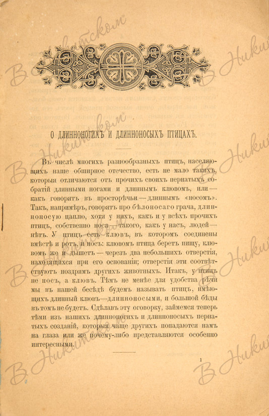 Кайгородов, Д. О длинноногих и длинноносых птицах. (С рисунками). [1-е издание]. [СПб.: Издание А.С. Суворина, 1900].