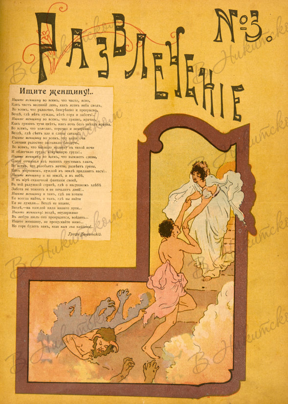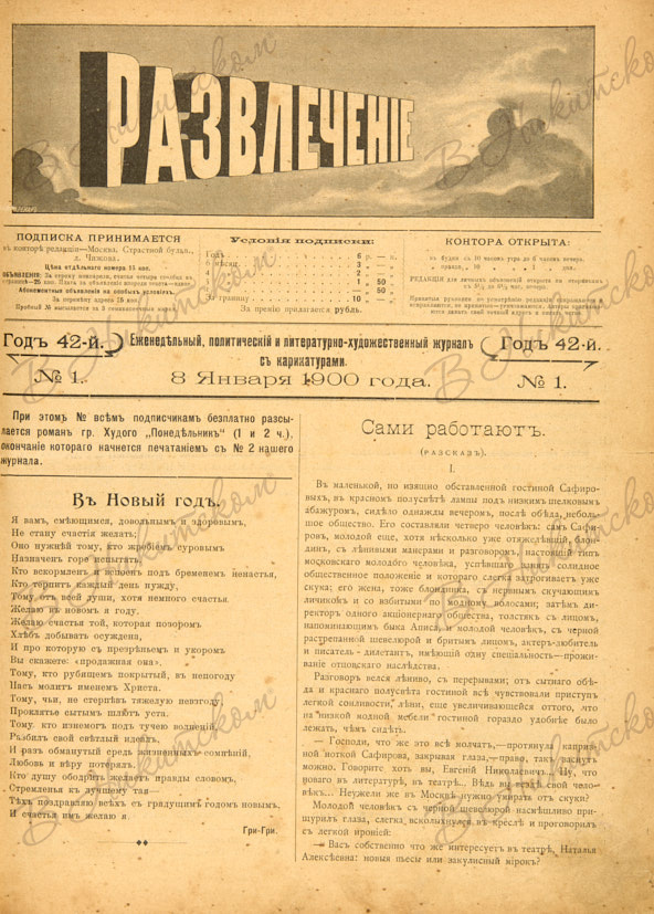 Развлечение» - иллюстрированный литературно-юмористический журнал, выходивший в Москве еженедельно в 1859-1916 годах. В журнале публиковались стихи, рассказы, повести; фирменным знаком «Развлечений» были карикатуры, печатавшиеся в каждом номере. С изданием сотрудничали В. Даль, Д. Минаев, А. Чехов.