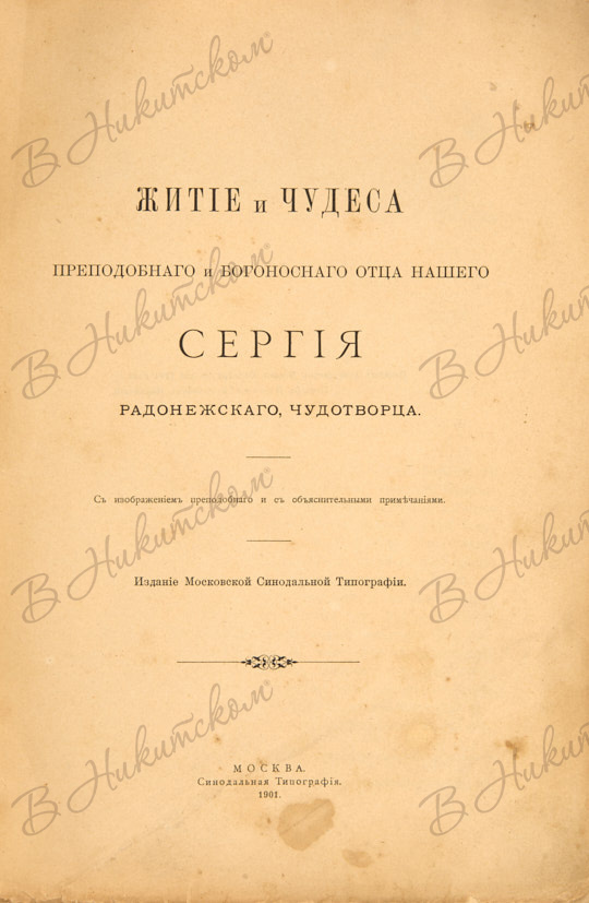 Житие и чудеса преподобного и богоносного отца нашего Сергия Радонежского, Чудотворца / С изображением преподобного и с объяснительными примечаниями. М.: Синодальная Типография, 1901.