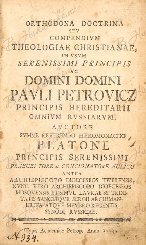 [Платон (Левшин). Православное учение, или Сокращенная христианская богословия. Для употребления его Имп. высочества пресветлейшего всероссийского наследника, благоверного государя цесаревича и великого князя Павла Петровича]. Platon. Orthodoxa Doctrina seu Compendium Theologiae Christianae, in usum Serenissimi Principis ac Domini Domini Pauli Petrovicz Principis Hereditarii omnium Russiarum… [Petropolis]: Typis Academiae Petrop., 1774.