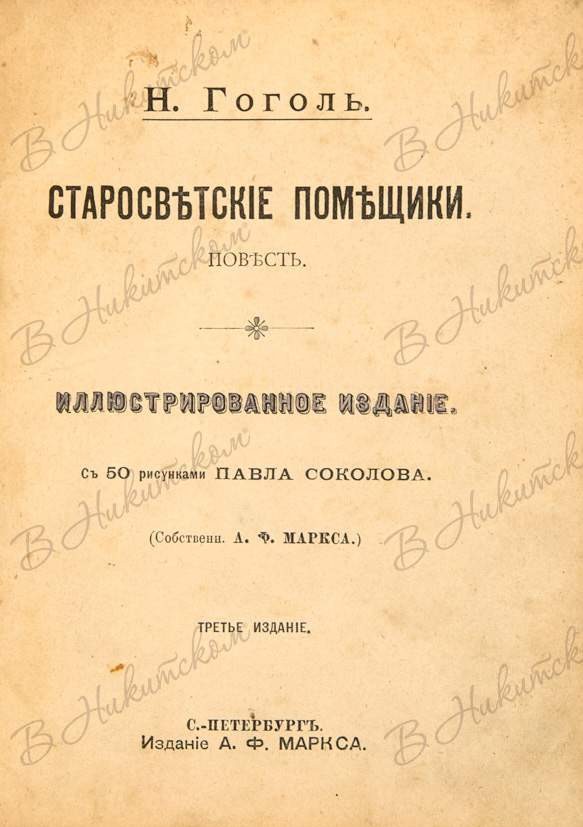 1. Гоголь, Н. Старосветские помещики. 3-е издание. СПб.: Издание А.Ф. Маркса, 1901. Повесть / Иллюстрированное издание. С 50 рисунками Павла Соколова. (Собств. А.Ф. Маркса). СПб.: Издание А.Ф. Маркса, 1901. 54 с., ил.