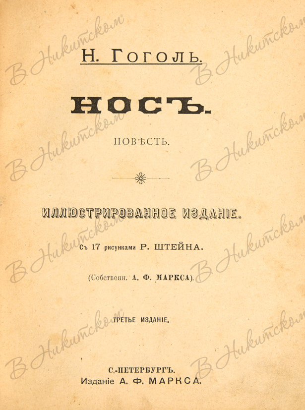 2. Гоголь, Н.В. Нос. Повесть / Иллюстрированное издание. С 17 рисунками Р. Штейна. (Собствен. А.Ф, Маркса). 3-е издание. СПб.: Издание А.Ф. Маркса, 1901. 27, [1] с., ил.