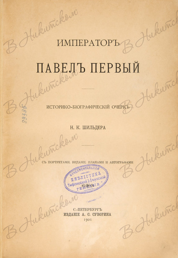 Шильдер, Н.К. Император Павел Первый. Историко-биографический очерк Н.К. Шильдера. СПб.: Изд. А.С. Суворина, 1901.