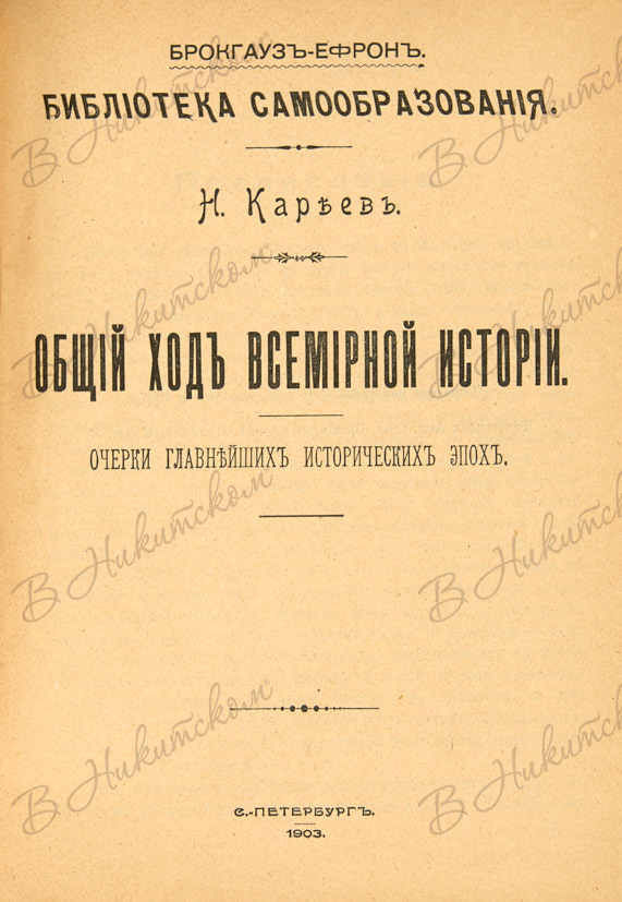 [Серия «Брокгауз-Ефрон. Библиотека самообразования»]. Кареев, Н.И. Общий ход всемирной истории. СПб.: Типография Акц. Общ. Брокгауз-Ефрон, 1903.