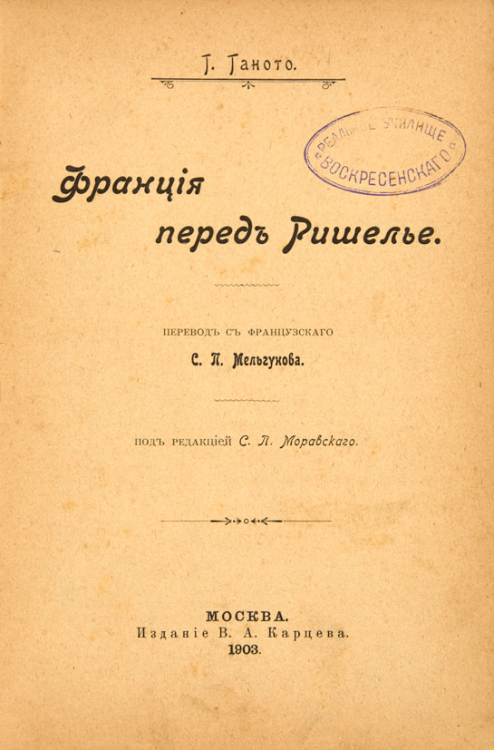 Ганото, Г. Франция перед Ришелье / пер. с фр. С.П. Мельгунова, под ред. [и с предисл.] С.П. Моравского. М.: В.А. Карцев, 1903.