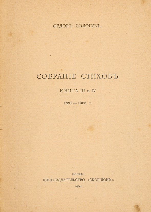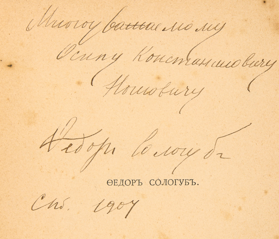 [4], 188 с., [4] с. 20 х 16 см. Во владельческом переплете, новые форзацы. Бумажный экслибрис Д.Е. Гольдштейна на форзаце, «лисьи» пятна. На авантитуле дарственная надпись: «Многоуважаемому / Осипу Константиновичу / Нотовичу /Федор Сологуб /Спб. 1907».