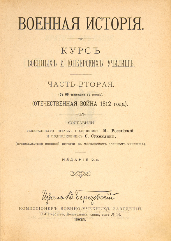 Военная история. Курс военных и юнкерских училищ / полковник М. Российский, подполковник С. Сухомлин. Ч.2-3. СПб.: Издал В. Березовский, 1905-1908.
