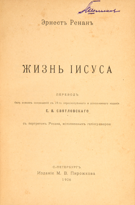 Ренан, Э. Жизнь Иисуса / перевод без всяких сокращений с 19-го пересмотр. и доп. изд. Е.В. Святловского. СПб.: М.В. Пирожков, 1906.