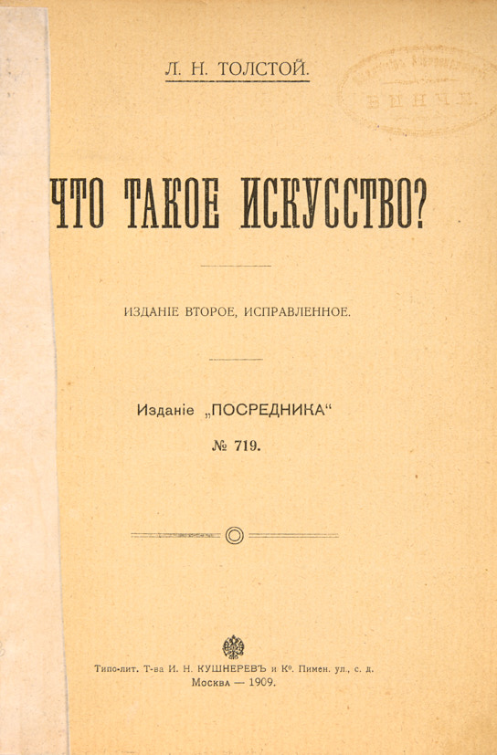 Толстой, Л.Н. Что такое искусство? Издание 2-е, исправл. М.: Издание «Посредника», 1909.