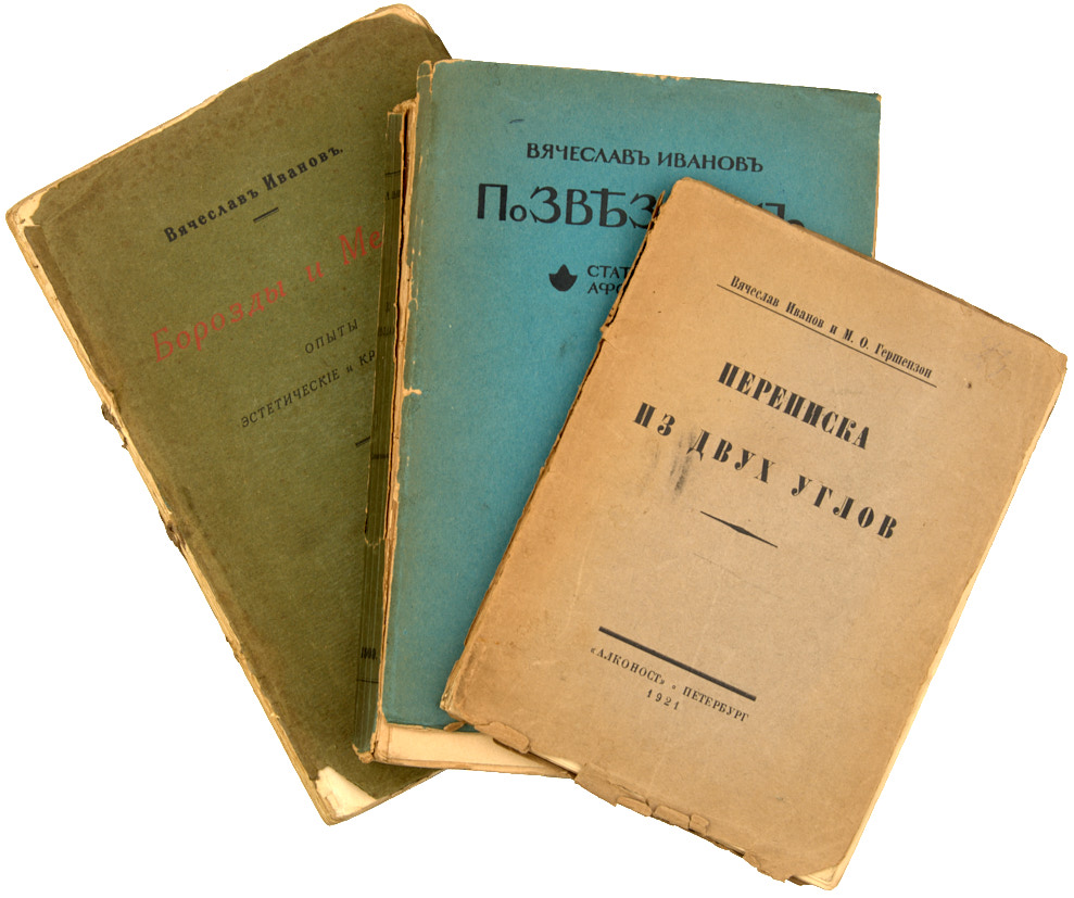 2. Иванов, Вяч., Гершензон, М.О. Переписка из двух углов. Пб.: Алконост, 1921. 62, [2] с. 19 х 13,5 см. В издательской обложке. Надрывы и мелкие утраты по краям обложки, листы обложки отделены, утрата фрагментов корешка, владельческая надпись на корешке.