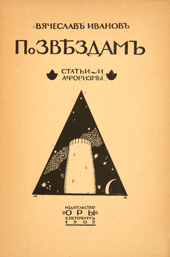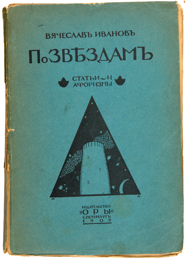 3. Иванов, Вяч. По звездам. Статьи и афоризмы. СПб.: Издательство «Оры», 1909. [8], 438, [2] c. 21 х 14,5 см. В издательской обложке работы М. Добужинского. Надрывы корешка и краев обложки, передняя обложка отделена. Блок в хорошем состоянии. Первое издание сборника.