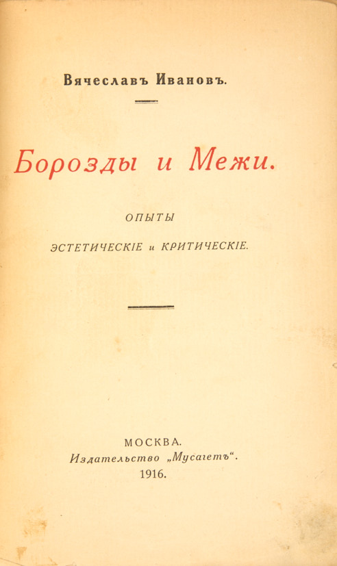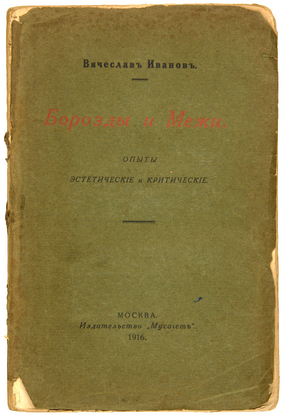 1. Иванов, Вяч. Борозды и Межи. Опыты эстетические и критические. М.: Мусагет, 1916. [8], 351 с. 22,3 х 14,6 см. В издательской обложке. Утрата корешка, передняя обложка отделена, мелкие надрывы и утраты по краям обложки, незначительные «лисьи» пятна, утрата мелкого фрагмента поля у нескольких страниц.