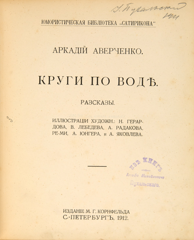 [Юмористическая библиотека «Сатирикона»]. Аверченко, А. Круги по воде. Рассказы. СПб.: Издание М.Г. Корнфельда, 1912.