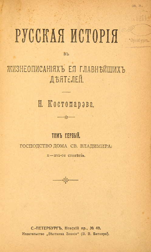 Костомаров, Н.И. Русская история в жизнеописаниях ее главнейших деятелей. В 3 т. Т. 1. СПб.: Вестник знания, [1912].
