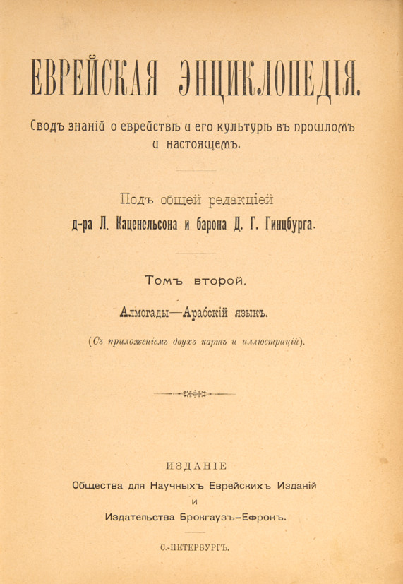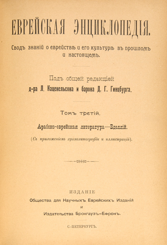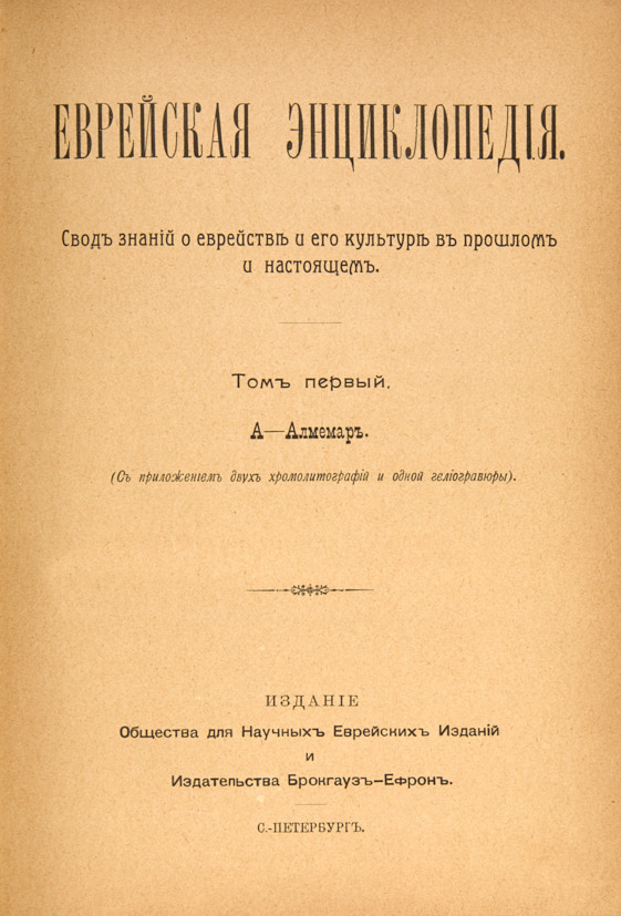 Еврейская энциклопедия - первый крупный энциклопедический свод знаний о еврействе на русском языке. Энциклопедия была опубликована в 1908–1913 гг. в шестнадцати томах в Санкт-Петербурге «Обществом для научных еврейских изданий» и «Издательством Брокгауз — Ефрон». Основой и образцом для нее послужила вышедшая несколько годами ранее двенадцатитомная «The Jewish Encyclopedia» (London; New York, 1901 — 1906). Однако ее материал был существенно дополнен и расширен авторами «Еврейской Энциклопедии Брокгауза» во всем, что касалось истории, культуры и современного положения еврейских общин в Восточной Европе. В работе над «Еврейской энциклопедией Брокгауза» принимали участие виднейшие представители российской гебраистики и востоковедения: А. Гаркави, Д. Гинцбург, Ю. Гессен, С. Дубнов, И. Маркон, Н. Переферкович.