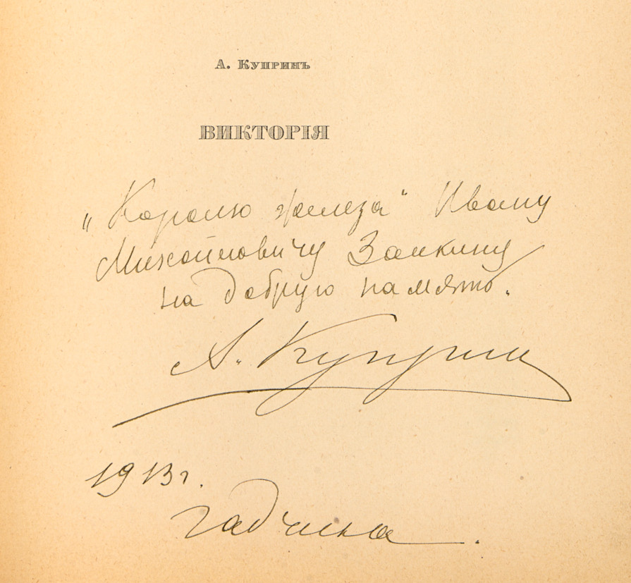 [4], 169, [6] с. 23,5 x 19 см. В издательской обложке. Мелкие надрывы по краям обложки, надрыв корешка, утрата уголка с.69-70 (текст не задет). На шмуцтитуле дарственная надпись: «"Королю железа" Ивану / Михайловичу Заикину / на добрую память. / А. Куприн. / 1913 г. / Гатчина».