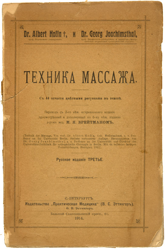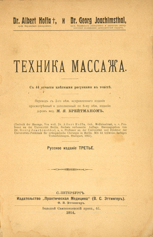Техника массажа / С 44 отчасти цветными рисунками в тексте; пер. с 2-го нем. Испр. Изд. Д-ра М.Я. Брейтмана. СПб.: Издательство «Практическая Медицина», 1914. 3-е русское издание.