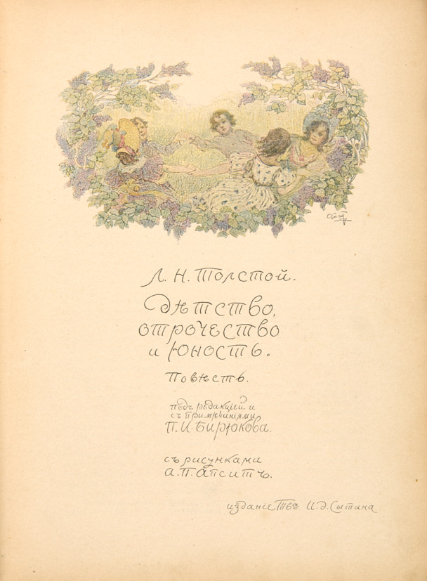 Толстой, Л.Н. Детство, отрочество и юность / под ред. и с прим. П.И. Бирюкова; рис. А.П. Апсита. М.: Изд. Т-ва И.Д. Сытина, 1914.