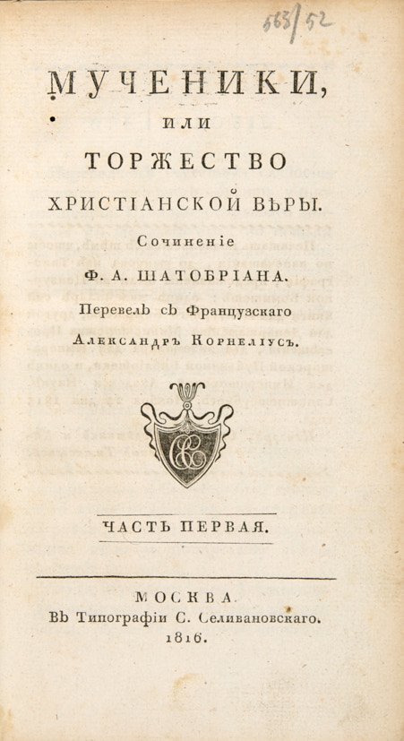 Шатобриан, Ф.А. Мученики, или Торжество христианской веры / пер. с франц. Александр Корнелиус. В 3 ч. Ч. 1. М.: В Тип. С. Селивановского, 1816.