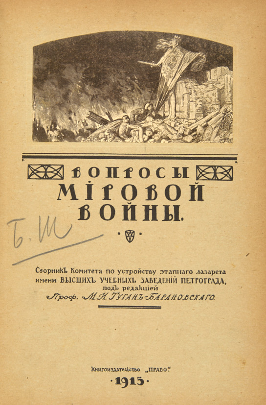 Вопросы мировой войны. Сборник статей под ред. проф. Туган-Барановского / в сборнике приняли участие: Е.В. Баумгартен, акад. В.М. Бехтерев, проф. М.П. Боголепов [и др.]. Пг.: Изд. Юридического книжного склада «Право», 1915.