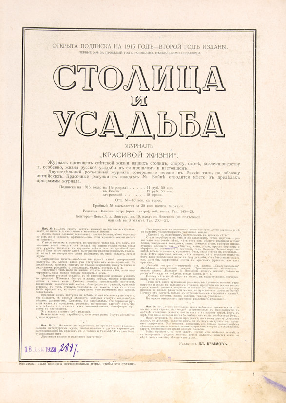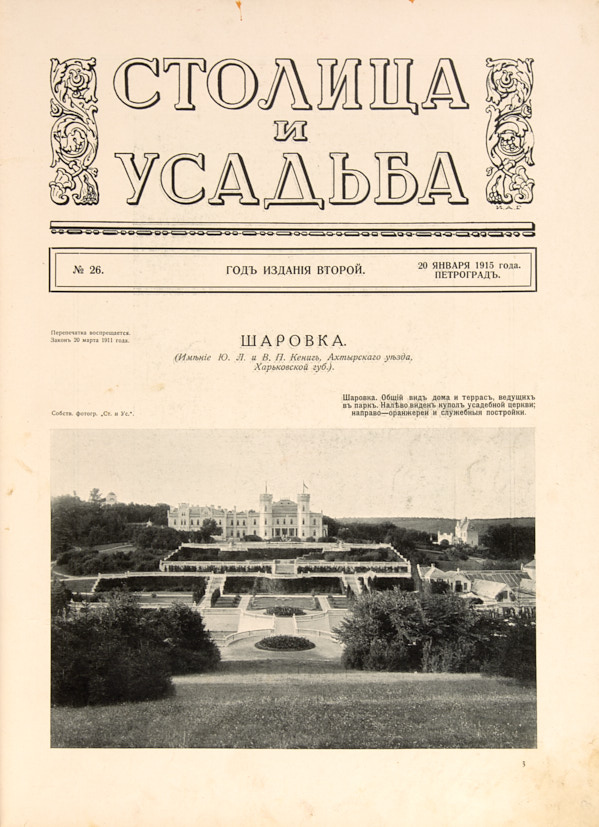 [Подшивка из 11 номеров]. Столица и усадьба. № 25-35 за 1915 г. Пг.: Изд. В. Крымова; Тип. Т-ва Р. Голике и А. Вильборг, 1915.