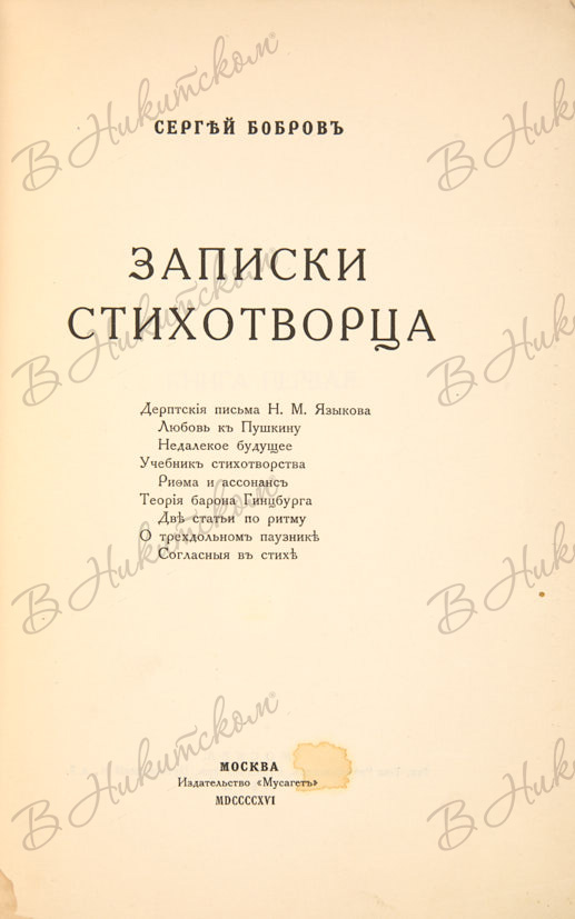 Бобров, С.П. Записки стихотворца. М.: Мусагет, 1916.