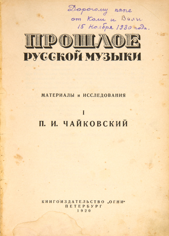Прошлое русской музыки. Материалы и исследования. I. П.И. Чайковский. Пб.: Книгоиздательство «Огни», 1920.