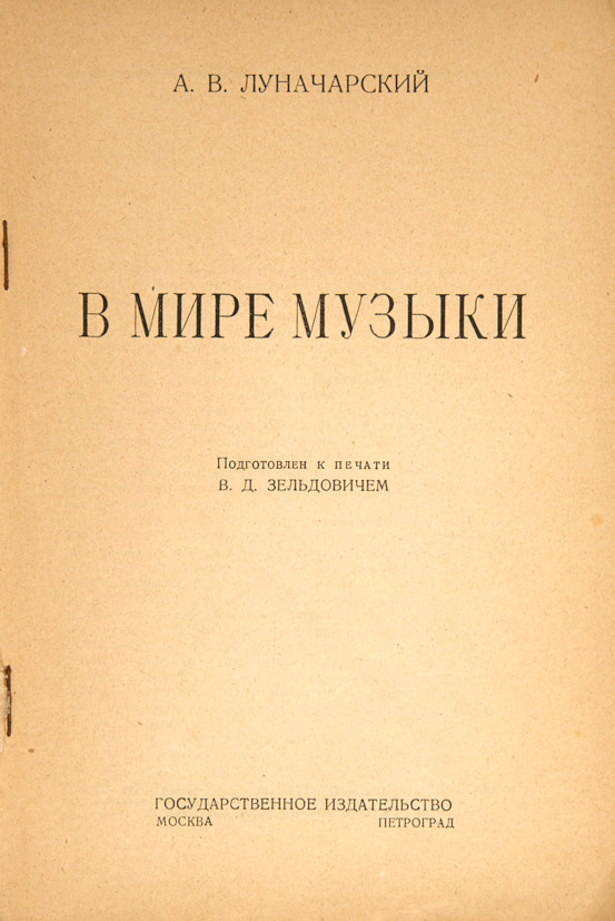 Луначарский, А.В. В мире музыки / подготовлен к печати В.Д. Зельдовичем. М.; Л.: Государственное издательство, 1-я Образцовая типография, 1923.
