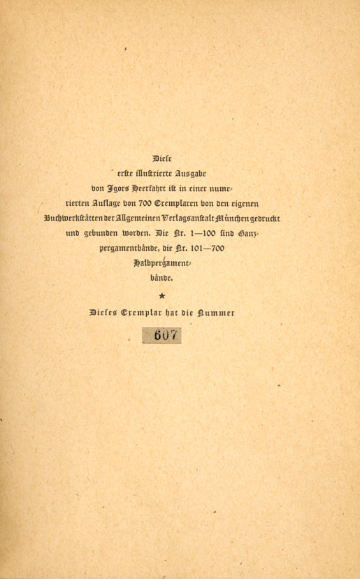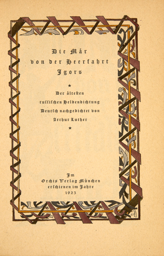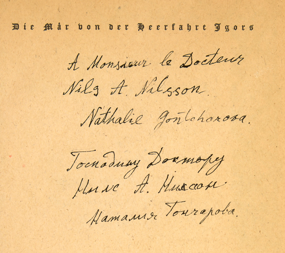[Автограф Н. Гончаровой]. [Слово о полку Игореве / пер. А. Лютера, пошуары. Н. Гончаровой]. Die Mar von der Heerfahrt Igors. Мюнхен: Orchis Verlag, 1923.