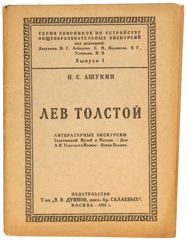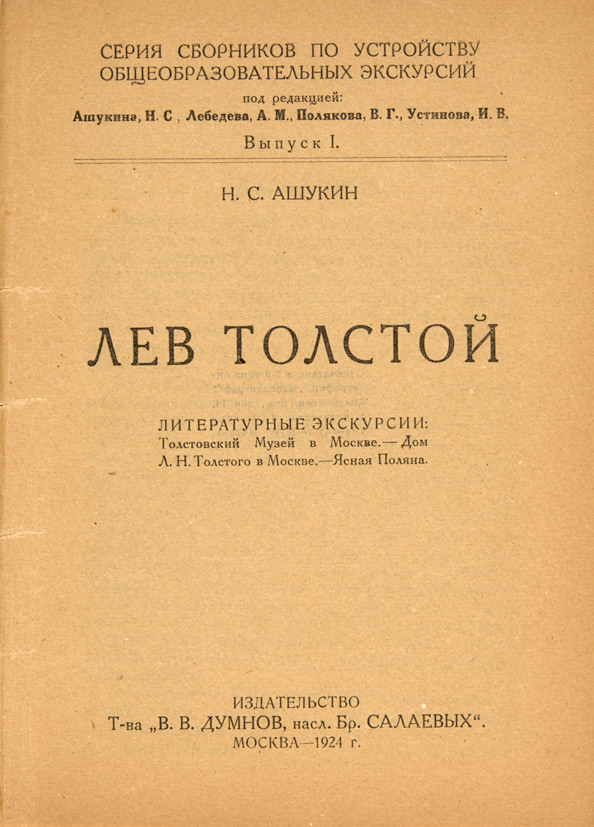 [Серия сборников по устройству общеобразовательных экскурсий]. Вып. 1. Ашукин, Н.С. Лев Толстой. Литературные экскурсии: Толстовский Музей в Москве. Дом Л.Н. Толстого в Москве. Ясная Поляна. М.: Издательство Т-ва «В.В. Думнов, насл. бр. Салаевых», 1924.