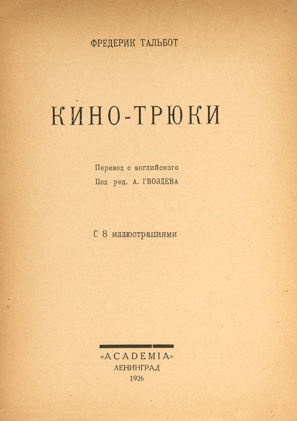Кино-трюки / перевод с англ. Под ред. А. Гвоздева. С 8 иллюстрациями. Л.: Academia, 1926.