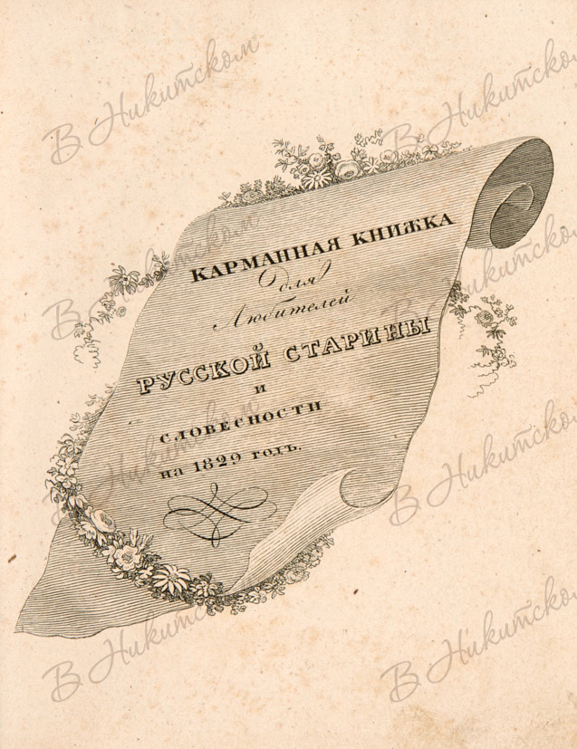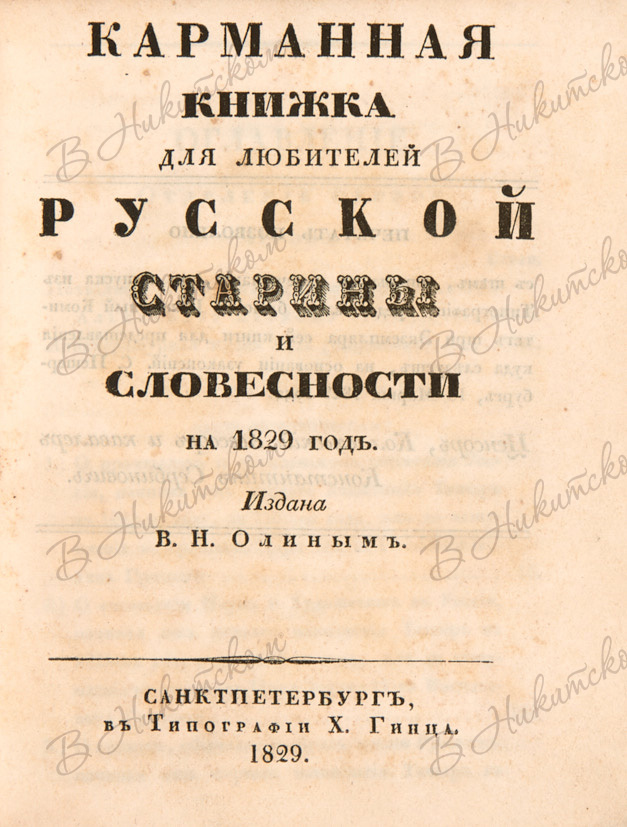 Карманная книжка для любителей русской старины и словесности на 1829 год / изд. В. Олиным. СПб.: в Тип. Х. Гинца, 1829.