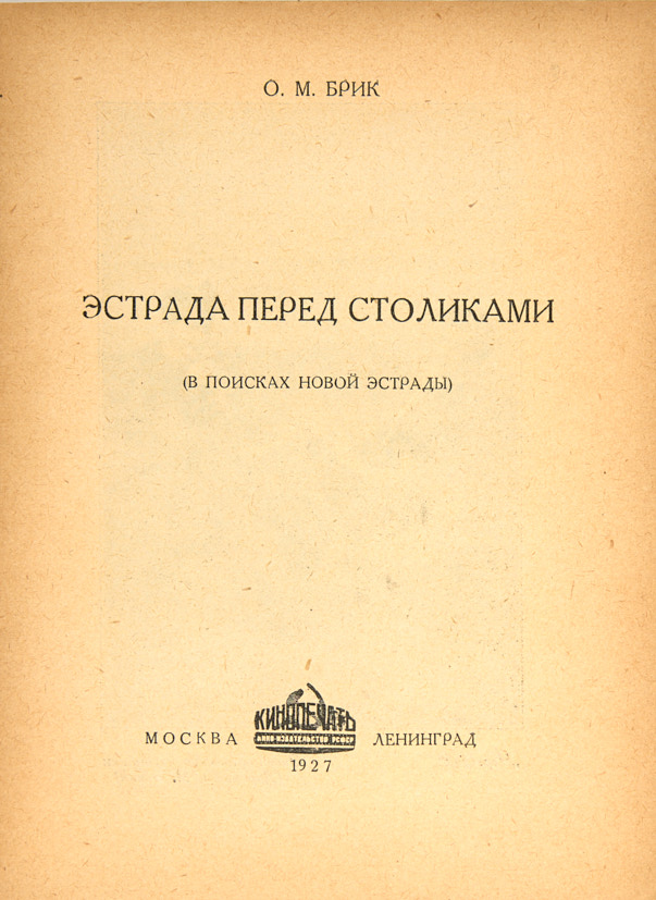 Брик, О. Эстрада перед столиками (В поисках новой эстрады). М.; Л.: КИНОПЕЧАТЬ, 1927.